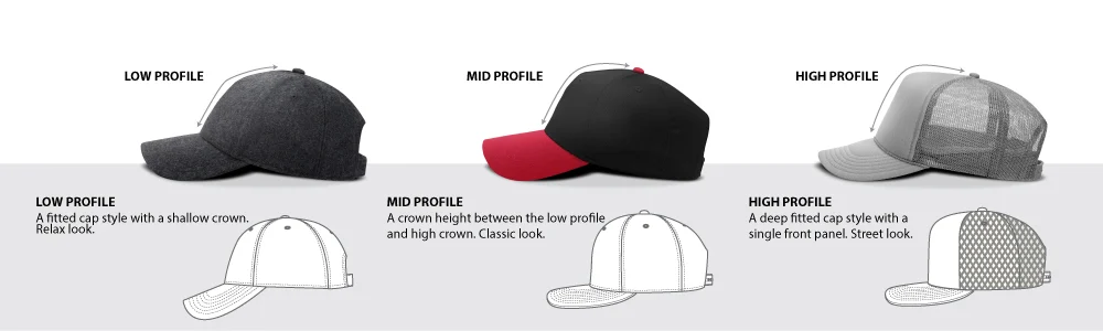 The profile refers to the height of the crown. Low-profile hats have short crowns, while high-profile hats have taller ones.